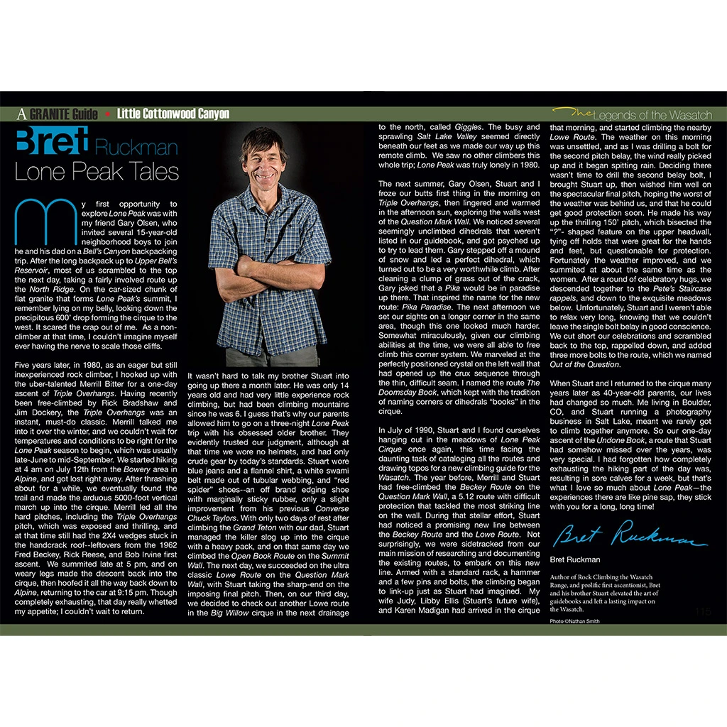 Covering the Wasatch Front from Ferguson Canyon to Lone Peak and containing more than 1677 routes, A Granite Guide is the most comprehensive guide to Salt Lake’s granite canyons available. From single pitch classics to multipitch alpine adventures, A Granite Guide is your source for climbing above Salt Lake City, Utah. A Granite Guide also covers Salt Lake’s rich climbing history with a 10-page historical section, and 10 essays from prominent Salt Lake climbers.